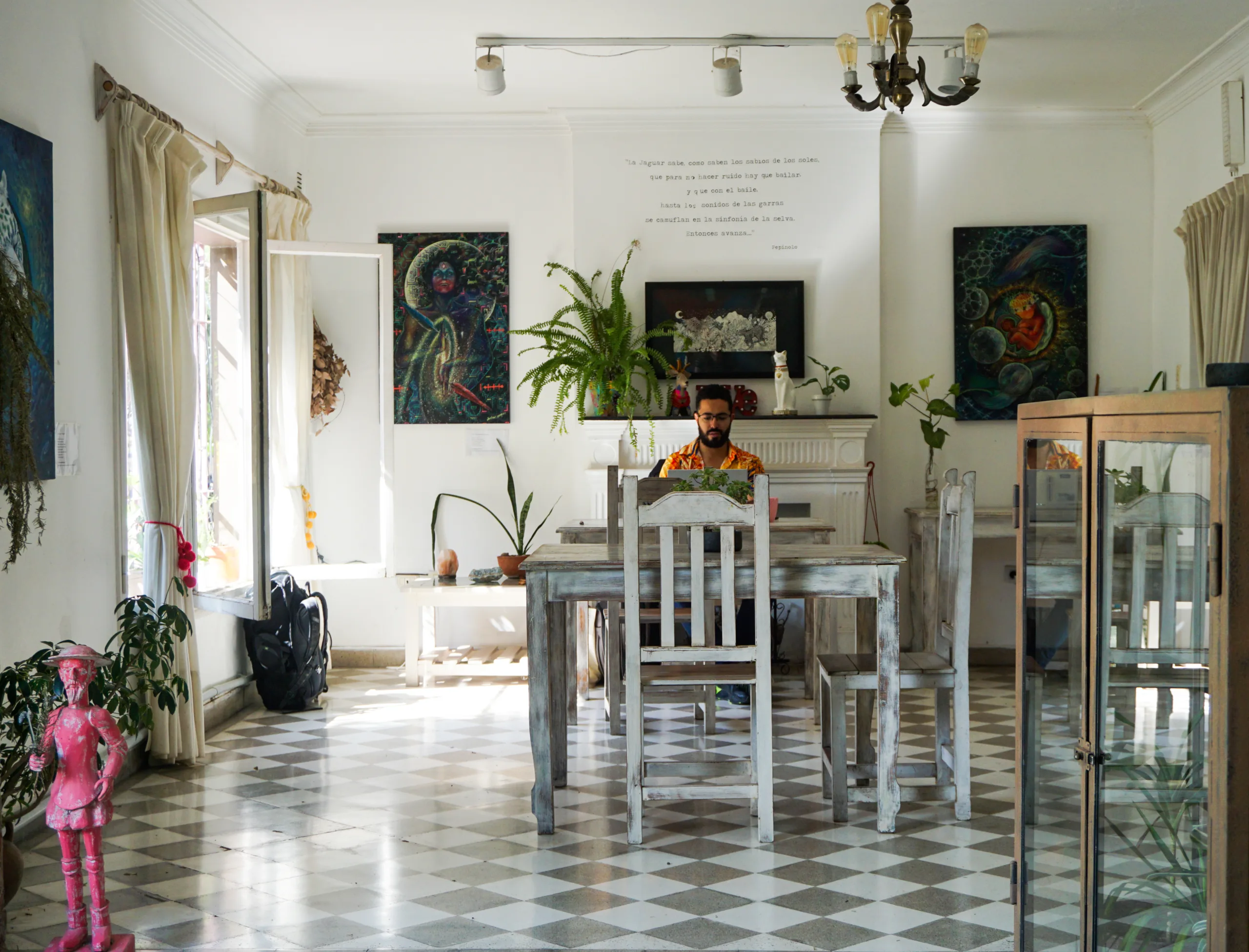 Nuestros huéspedes disponen de un espacio de coworking ambientado con detalle para su comodidad. La sala recibe eventualmente clases, charlas y reuniones.